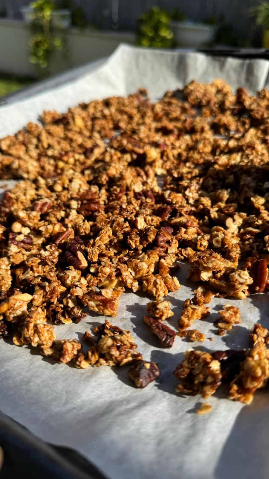משטחים את הגרנולה היטב ודק בתבנית ושולחים לאפייה של 10-12 דק׳ או עד שהגרנולה משחימה בצורה אחידה.